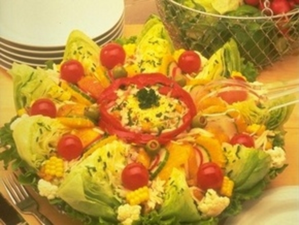 5. На плоское блюдо выкладываем листья салата, далее - дольки капусты (в центр можно выкласть любой мясной или рыбный салат), затем - кружочки апельсина, огурца, редиса.
