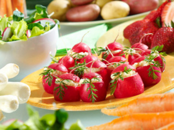 Совет: под каждую редиску можно подложить кружочек огурца и все полить сметаной.