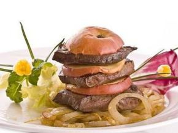 5. Выкладываем на тарелки: сначала - лук, а потом чередующиеся кусочки печени и яблок. Перед тем, как подавать, можно поставить блюдо на 2-3 минутки в микроволновку (мощность - 700) или в духовку на 5-7 минут 175°С. Украшаем и подаем.