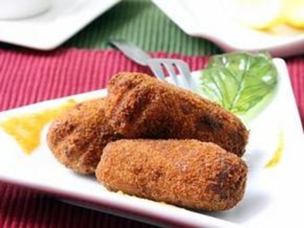 5. Из фарша формируем лепешки, на середину выкладываем фарш, края защипываем, придав форму цилиндра, обмакиваем в льезоне, панируем в сухарях.