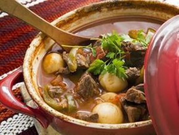 3. Делаем огонь поменьше, кладем паприку, быстро перемешиваем, сразу же добавляем мясо, измельченный чеснок, смешанный с тмином, доливаем немного воды и, изредка помешивая, продолжаем тушить на слабом огне. При необходимости добавляем воду, но понемногу, чтобы мясо тушилось в малом количестве жидкости.