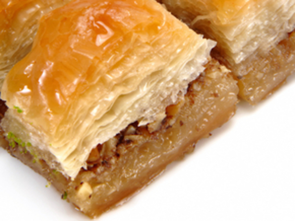 7. В 1/4 л воды 10 минут поварим сахар, мед, лимонный сок и цедру и этим горячим сиропом польем готовую пахлаву. Дадим ей остыть, прежде чем подавать на стол.