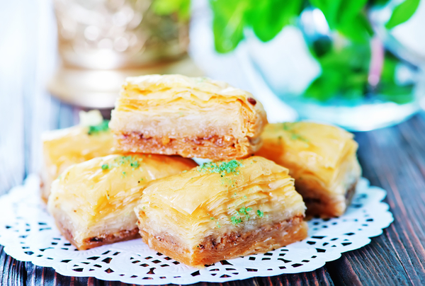 4. Далее пахлаву разрезаем на ромбы или треугольники и смазываем желтком, смешанным с шафраном. В середину каждого кусочка можно положить половинку ореха.