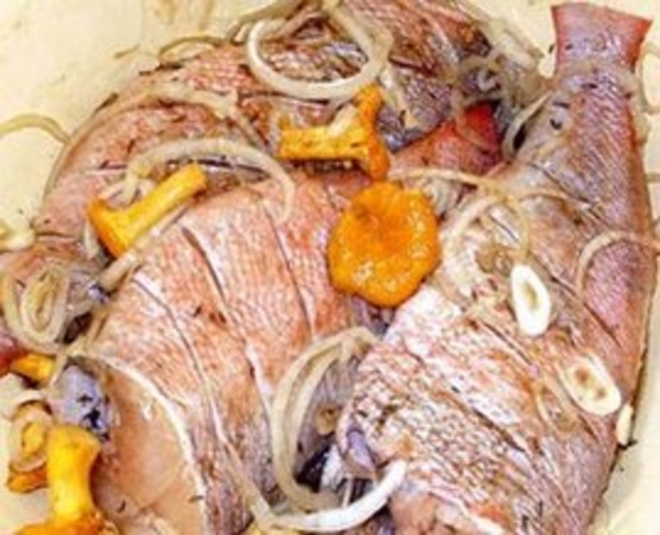 Готовых окуней выложить на блюдо, полить небольшим количеством бульона. Отдельно подать хрен.