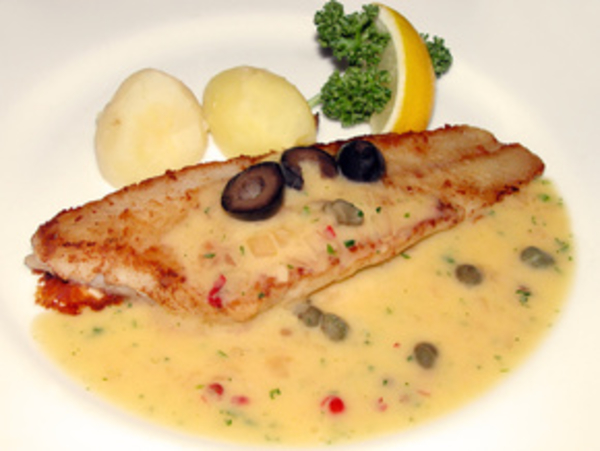 Вынуть готовую рыбу на блюдо и залить соусом, в котором тушилась рыба, предварительно процедив его и заправив сливочным маслом и желтком. Украсить отварным картофелем, политым разогретым маслом