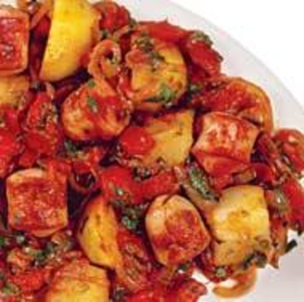 Добавить резаные томаты и томатное пюре и 2 стакана воды. Посыпать бульоном, паприкой и сахаром, как следует посолить и поперчить, размешать и довести до кипения.