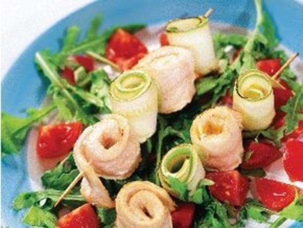 Свернуть ленты из кабачков в рулетики. Нанизать на длинные деревянные шпажки по 2 рулетика из кабачков и кефали, чередуя их между собой.