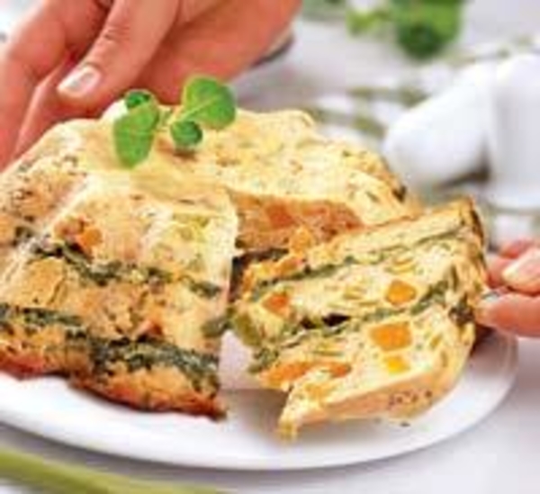 Шпинат промыть, обсушить и порубить. В сковороде разогреть 15 г сливочного масла, тушить в нем шпинат 5 мин. Оставшимся сливочным смазать форму, выложить в нее треть кабачковой смеси, затем слой шпината, посыпать эстрагоном. Сверху выложить еще треть кабачков, слой шпината и оставшиеся кабачки.