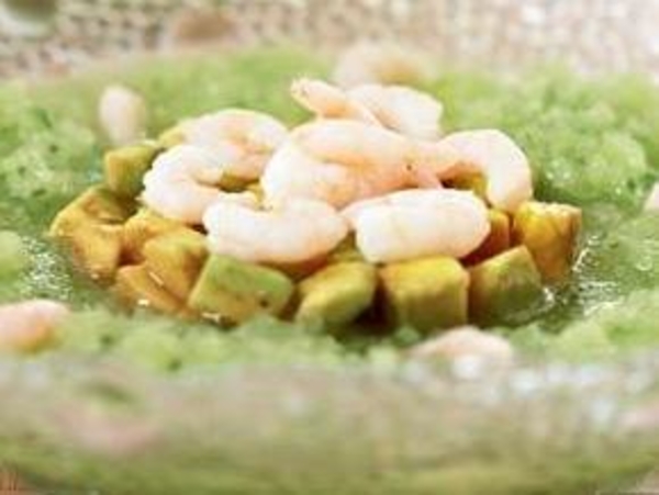 Добавить 2 ст. л. оливкового масла и половину выделившегося из огурцов сока; взбить венчиком. 1/3 заправки смешать с креветками, остальное с авокадо.