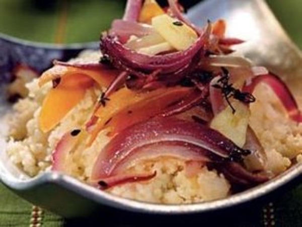 Выложить на блюдо кускус, сверху разложить запеченные овощи