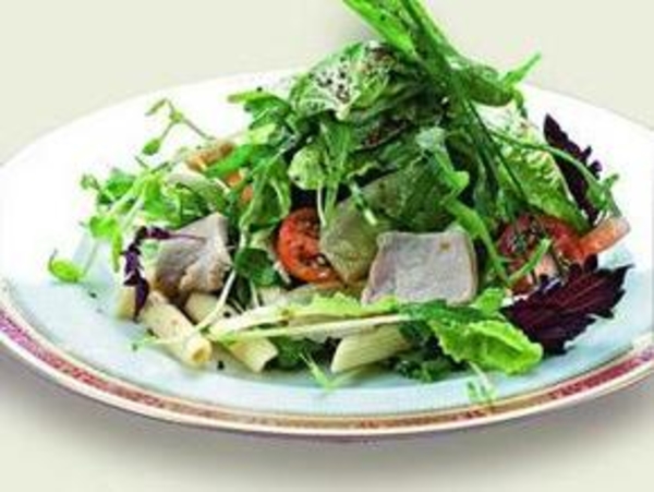 В миске смешать "перья" и порванные листья латука и рукколы. Остывшего тунца нарезать тонкими ломтиками.