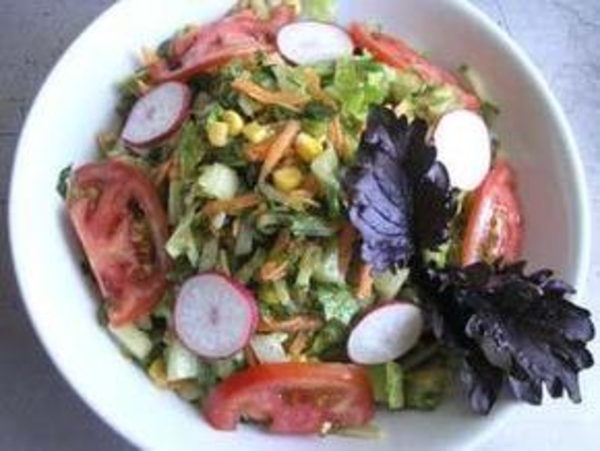 Все заранее подготовленные ингредиенты салата перемешать и выложить в глубокую тарелку. Полить заправкой, украсить ломтиками помидора и редиса