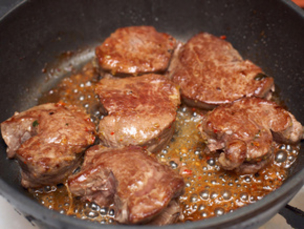3. Взять кастрюлю с толстым дном, прогреть, влить вино. Переложить содержимое сковородки в кастрюлю и тушить мясо не менее 2-х часов, добавляя понемногу вино и бульон, убавить огонь и накрыть крышкой.