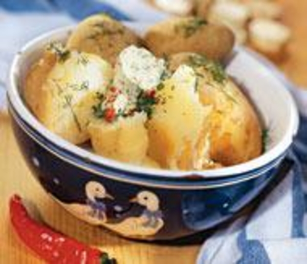 Картофель переложить в сервировочную посуду, полить соусом, украсить листиками сельдерея. Подавать как самостоятельное блюдо или как гарнир к мясу или рыбе.