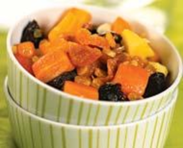 3. Разогреть в сковороде масло, обжарить лук. Переложить его в форму для выпечки. Добавить морковь с картофелем, чернослив, курагу, изюм, мед, тертый имбирь, корицу и лимонный сок. Влить 1 стакан овощного отвара, накрыть форму крышкой и готовить в разогретой до 160ºС духовке 30 мин.
