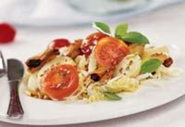 Капусту тонко нарезать. Шалот очистить и порубить. Помидоры вымыть и разрезать пополам. Смешать капусту и шалот. Посолить, поперчить, сбрызнуть маслом и хорошо перемешать. Выложить смесь на блюдо.