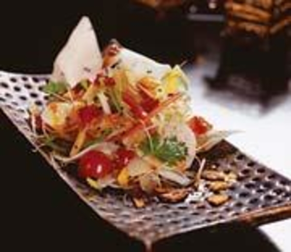 После этого гребешок нарезать вдоль и очень быстро, в течение 10 сек., обжарить во фритюре. Капусту, сладкий перец и лук-порей нарезать тонкой длинной соломкой. Дайкон нарезать тонкими кружочками.