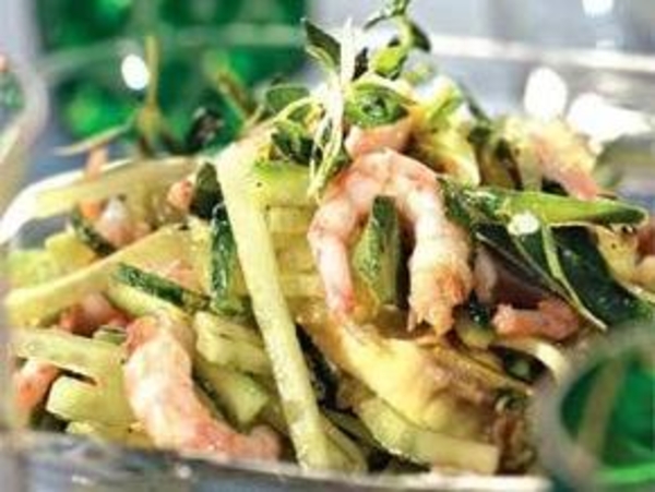 В салатнице смешать креветки, авокадо и огурцы, влить заправку.
