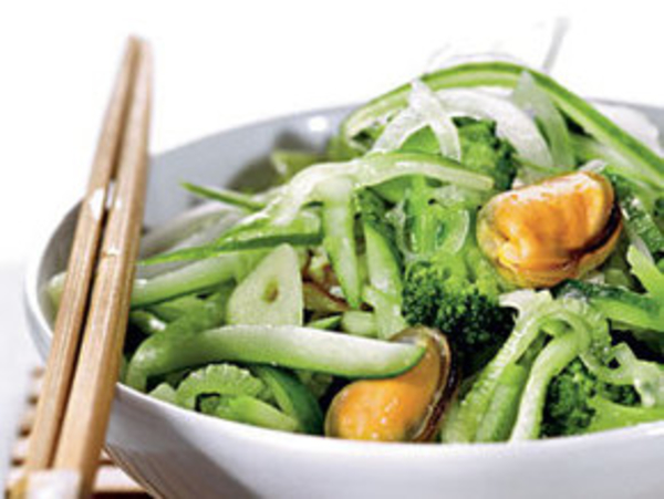 Огурцы вымыть, нарезать тонкой соломкой. Лук и чеснок очистить. Лук нарезать тонкими полукольцами, чеснок – тонкими ломтиками. Смешать в миске брокколи, огурцы, лук, чеснок и мидии.