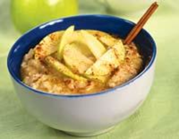 2. Яблоки вымыть, очистить от кожуры и нарезать тонкими ломтиками. Добавить в горячую кашу яблоки, корицу и сливки. Быстро перемешать и подать к столу.