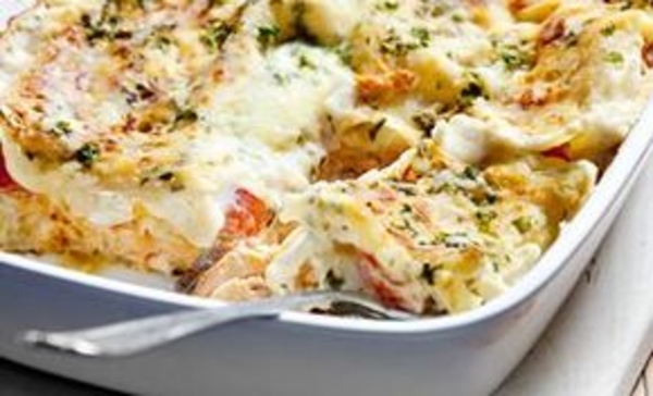 Белый соус в этом блюде можно сделать нежирным – надо взять менее жирное молоко. А чтобы он получился пожирнее и, соответственно, повкуснее, можно добавить в него немного сливок и сливочного масла. Кроме того, вы можете добавить в соус пряности и пряные травы по своему вкусу (например, тертую лимонную цедру).