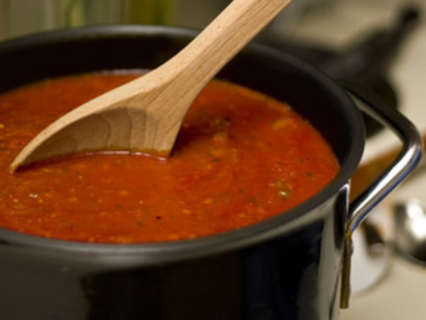 Слейте маринад и смешайте с луком. Положите помидоры и листья орегана. Готовьте на умеренном огне, пока соус не загустеет.