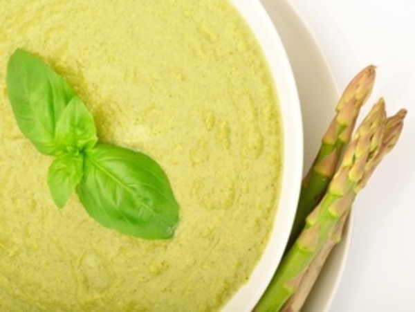 Добавить специи по вкусу. Заправить маслом. Украсить целой спаржей или листиками базилика.