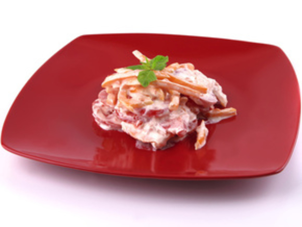 Отдельно заправляем помидоры и перец творожно-сметанным соусом. Выкладываем на тарелку слой кружочков помидоров и слой соломки перца. Украшаем зеленью.