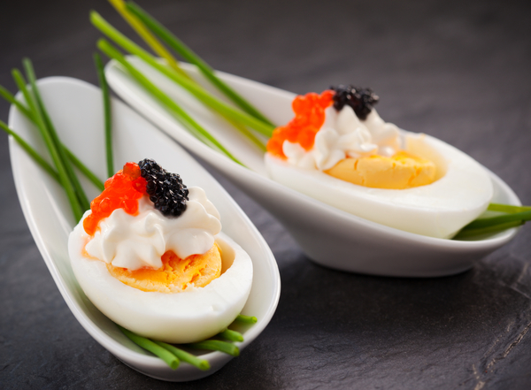 Охлажденные яйца разрезаем пополам и вынимаем желтки.