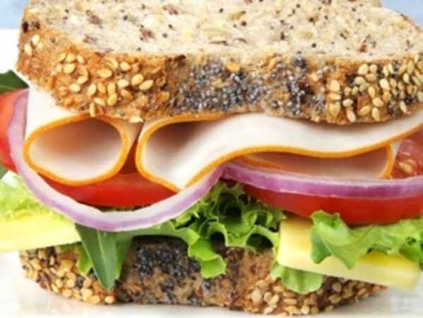 Выкладываем на ломтики сыр, потом листья салата. Затем помидоры и лук, нарезанные пластинками ветчину и сыр. Накрываем вторым ломтиком хлеба, тоже смазанным йогуртом.