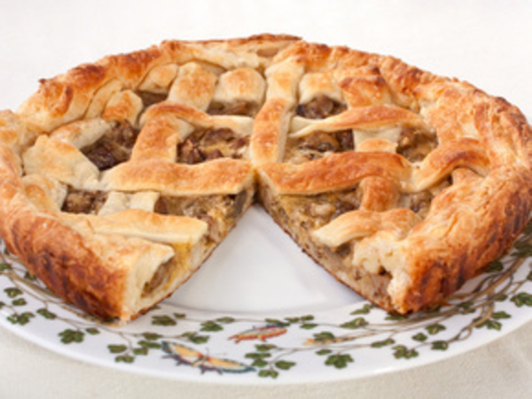 Тесто, если надо, раскатываем. Выкладываем в смазанную жиром форму, так чтобы были бортики. Выкладываем начинку из грибов. Тоненькие полоски теста выкладываем крест-накрест сверху пирога. Смазываем взбитым яйцом.