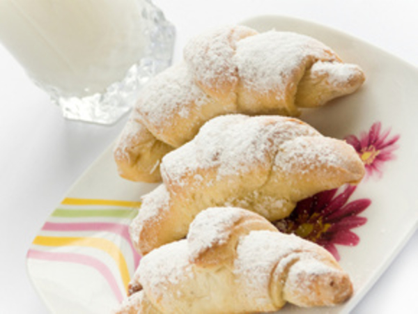 Свернуть от широкой части к кончику (к центру круга). Придать форму полумесяца, уложить на противень и выпекать до зарумянивания.