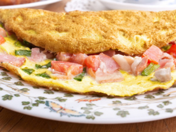 Яичную массу вылейте на сковороду, смазанную оливковым маслом, добавьте бекон и запеките до готовности.