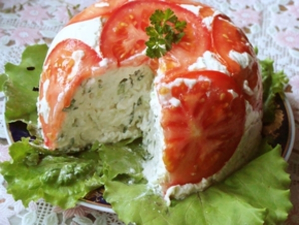 Грудку и помидоры нарезать небольшими кубиками. Сыр и яйца натереть на терке и перемешать с измельченным чесноком. Смазывая майонезом, выкладывать на блюдо слоями грудку, сырково-яичную массу, помидоры.