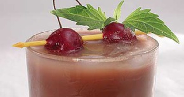 Какао соедините с сахаром, влейте вишневый сок, наливку, холодное кипяченое молоко и хорошо взбейте миксером. Перелейте коктейль в бокалы, в каждый положите по нескольку кубиков пищевого льда. Оформите 2–3 ягодами спелой вишни.