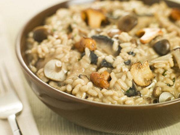 Грибы нарезать ломтиками, лук - колечками, чеснок пропустить через пресс. Разогреть в сковороде сливочное масло, спассеровать грибы и чеснок. Добавить рис, тушить до прозрачности, затем влить вино. Постепенно подливая горячий бульон, варить ризотто 20 минут на небольшом огне. Незадолго до окончания приготовления добавить сливки, пармезан и колечки зеленого лука, посолить и поперчить.