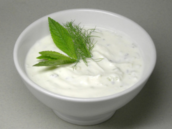Смешать йогурт, уксус, измельченный чеснок, все тщательно перемешать и посолить по вкусу. Можно добавить измельченную зелень.