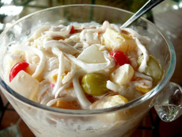 Рыбу нарезать тонкими ленточками, грибы разрезать пополам. Апельсины очистить от кожуры и белой пленки, мякоть нарезать кубиками. Яблоко разрезать пополам, удалить сердцевину и нарезать кубиками. Огурцы очистить от кожуры и нарезать небольшими кусочками. В вазочки выложить листья салата, положить огурцы и рыбу, затем апельсины и яблоки. Полить сверху майонезом, на край вазочки надеть нарезанный кружочками помидор и украсить зеленью и оливками.