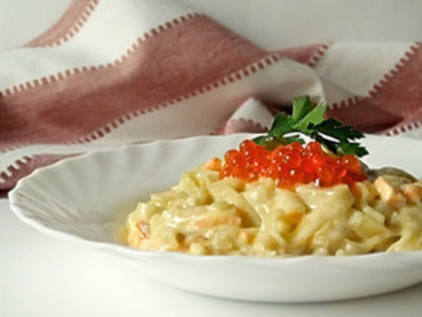 Лук очистить,мелко порезать и обжарить до прозрачности. Филе лосося нарезать полосками и добавив к луку обжарить до готовности. Добавить вино и выпарить. Влить сливки и проварить до загустения,посолить, поперчить. Пасту отварить и выложить в соус. Перемешать. Подавать украсив икрой и веточкой петрушки.