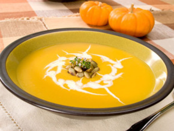 Нарезать мелко репчатый лук, кубиками куриную грудку. Оливковое масло разогреть в кастрюле. Обжарить на медленном огне лук и куриное мясо, помешивая, пока лук не станет золотистым, примерно 5-8 минут. Тыкву и морковь нарезать кубиками, добавить в кастрюлю, влить куриный бульон, и варить 20 минут, посолить.