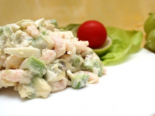 Смешайте яйца, креветки и авокадо и все заправьте майонезом. Украсьте листиком салата и подавайте.