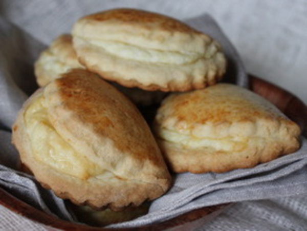 На доску, подпыленную мукой, раскатываем пласт теста толщиной ~5 мм. Стаканом или формочкой вырезаем круги. Потом ложкой аккуратно раскладываем начинку на наши кружочки, немного смещая ее от середины к краю. Затем осторожно прикрываем начинку половинкой теста, чуть прижимая пальцами в уголках. Серединка должна быть открыта!