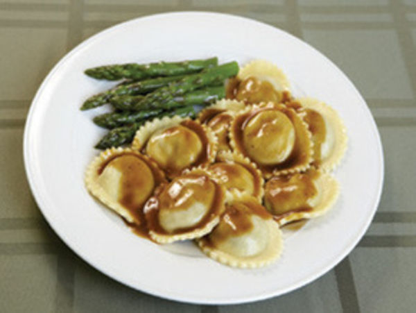 Готовые Равиоли разложить по тарелкам, полить сметаной, посыпать тертым сыром и украсить веточками укропа. Можно подавать со спаржей и грибным или соевым соусом.