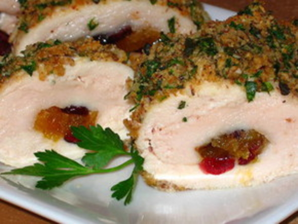 В отдельной посуде вилкой слегка взбить 2 яйца.Грудки отбить. В середину каждой грудки выложить немного меньше, чем 1 ч.л. начинки. Скрутить рулетом и закрепить зубочисткой, можно перевязать ниткой. Обмакнуть получившейся рулетик в яйце и обвалять в панировке.