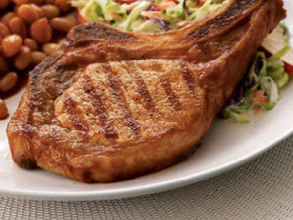 На большую белую тарелку выкладываем приготовленное мясо, а рядом с ним — овощной гарнир. В качестве декора используем измельченный базилик и нарезанный тонкими колечками лук (20 г).