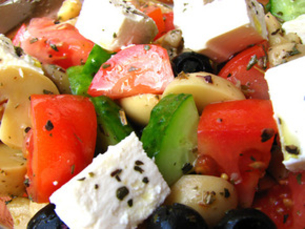 Смешать огурцы, помидоры, лук, целые шампиньоны и маслины с приправами и лимонным соком, а затем с оливковым маслом. Выложить в тарелку и сверху разложить кубики феты. Еще раз сбрызнуть оливковым маслом.