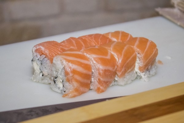 Отварите рис. Отделите все некачественные или непроварившиеся зёрна. Лист нори необходимо положить блестящей стороной вниз, сверху выложите рис тонким слоем. Над слоем риса делаем слой сыра "Филадельфия".