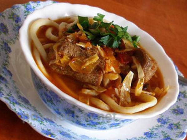 Замесить крутое тесто, скатать его в шар, дать полежать под салфеткой 15 мин, раскатать в тонкий пласт, свернуть в рулет, нарезать лапшу, отварить ее в подсоленной воде, вынуть, промыть раза два холодной водой, переложить в решето или дуршлаг, чтобы вода хорошо стекла, и одновременно полить лапшу растительным маслом, чтобы она не слежалась в один ком.