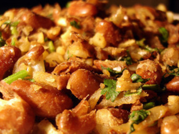 Нарезать лук, обжарить в растительном масле. Выложить фасоль в сковороду, добавить немного винного уксуса, перемешать.
