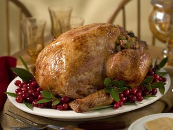 Затолкать внутрь лук, апельсин и половину темьяна. Запекать 1 час, пока индейка не начнет покрываться коричневой корочкой, покрыть фольгой и запекать еще 3 часа, поливая соками каждые 30 мин.